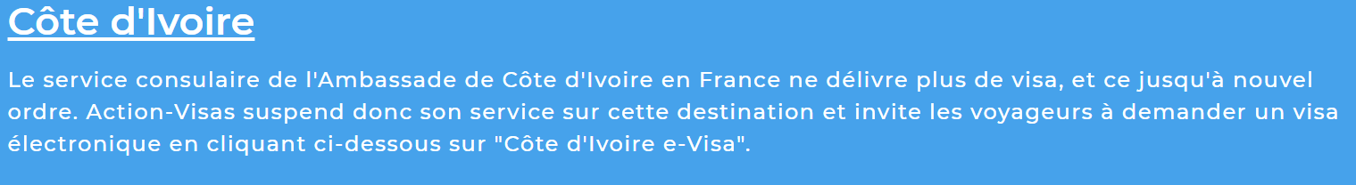 Pendant les vacances passées, une personne que je connais s’est débrouillée avant d’avoir son visa. En effet, elle ne savait pas que le service consulaire de l’ambassade ivoirienne en France ne délivrait plus de visa. Dorénavant, tout se fait en ligne, comme c’est le cas pour d’autres pays.